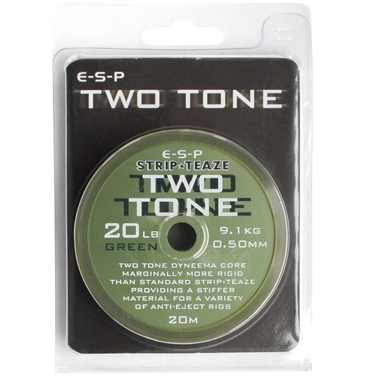De ESP Two Tone is marginaal fijner in diameter en iets stijver dan de orginele Strip Teaze van ESP. De Two Tone heeft een dicht geweven Dyneema kern en een doorschijnende polymeerbekleding met een soortelijk gewicht van 1,25. Dit houd in, dat de lijn zinkt en zich aanpast aan het structuur van de bodem. Kortom, de Two Tone is een veelzijdig onderlijn materiaal dat kan worden gebruikt voor diverse rigs en aas presentaties.