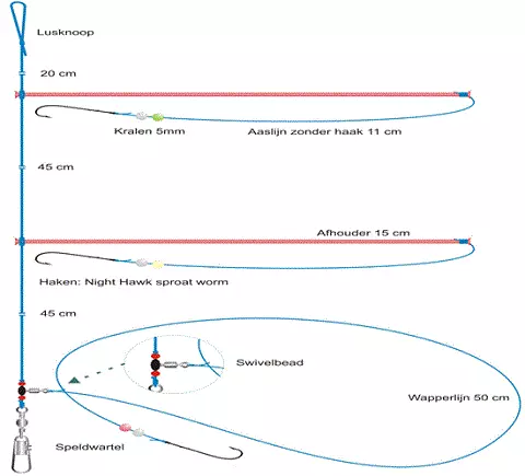 Onderlijn met twee afhouders en een dwarrellijn onder het lood.